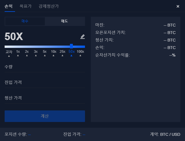 주문방식 맨 우측에 계산기 모양의 아이콘이 있는데 그것을 클릭하면 아래 이미지처럼 손익, 목표가, 강제청산가 등을 계산할 수 있는 계산기를 지원합니다.