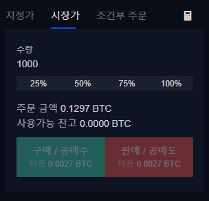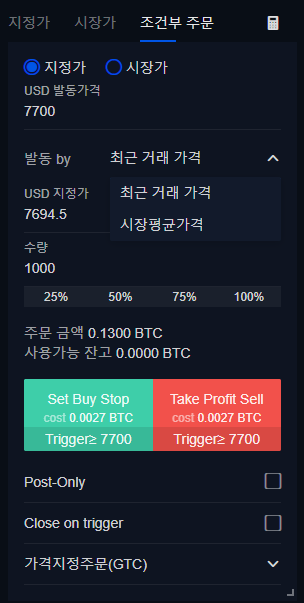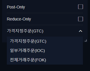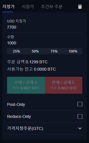 Post-Only : 체크한다면, 시장가는 발동되지 않고 지정가로만 거래가 이루어집니다.