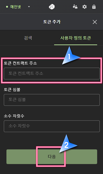 4. 토큰 컨트랙트 주소에 복사한 컨트랙트 주소를 붙여넣기 하시면 자동으로 토큰 심볼과 소수 자릿수는 채워집니다.