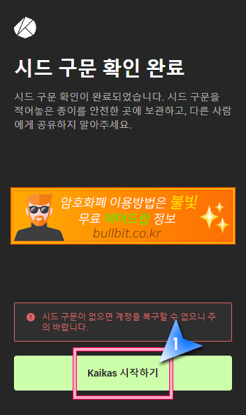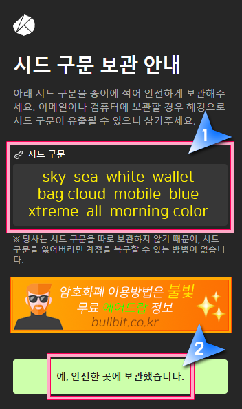 6. 가장 중요한 시드 구문 보관 안내입니다. 가끔 TV에서 비트코인 지갑 비밀번호를 까먹어서 몇천억 자산을 찾지 못한다는 기사를 본적이 있을 겁니다. 바로 이 시드 구문을 잊어버려서 그렇습니다. 그만큼 지갑 복구시 중요한 문구이므로 반드시 별도 작성하셔서 보관하셔야 합니다. 단정적으로 말씀드려서 시드 구문을 잃어버리면 계정 복구 방법은 없습니다. 절대 잊어버리면 안되고 타인에게 알려줘서도 안됩니다.