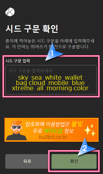 7. 시드 구문을 다시한번 입력해주시고 확인 버튼을 누릅니다.