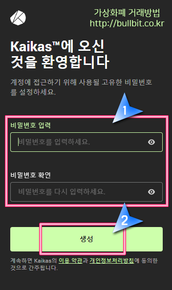 4. 카이카스 지갑에 로그인할 때 사용할 비밀번호를 입력하고 다시한번 더 입력을 하신 후, 생성 버튼을 클릭합니다.