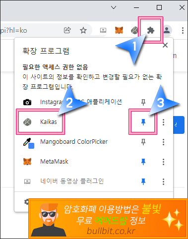 3. 확장 프로그램을 추가하셨다면 브라우저 우측 상단의 퍼즐 모양을 클릭한 후, KaiKas를 클릭합니다. 참고로 우측의 압정 표시를 클릭하시면 아래 이미지처럼 퍼즐 모양 옆으로 카이카스 지갑 단추가 고정되어서 관리하기 편리합니다.