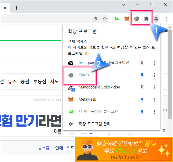 1. 크롬 브라우저 우측 상단의 카이카스 아이콘을 클릭합니다.