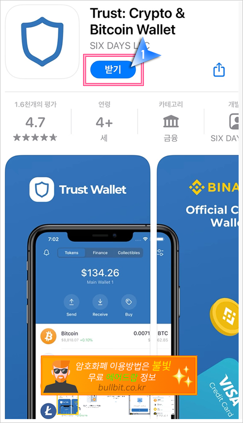 3. 앱 화면에서 "받기" 또는 "설치"를 눌러서 트러스트월렛을 설치해주세요.