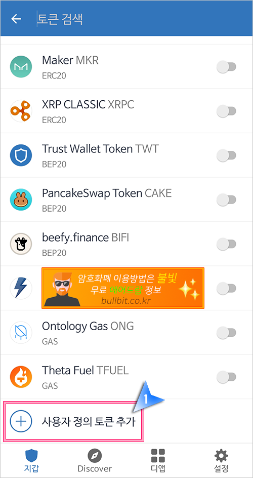 8. 돋보기 모양에 코인을 직접 코인명을 입력하여 검색하거나 '사용자 정의 토큰 추가' 버튼을 눌러서 추가할 수도 있습니다.
