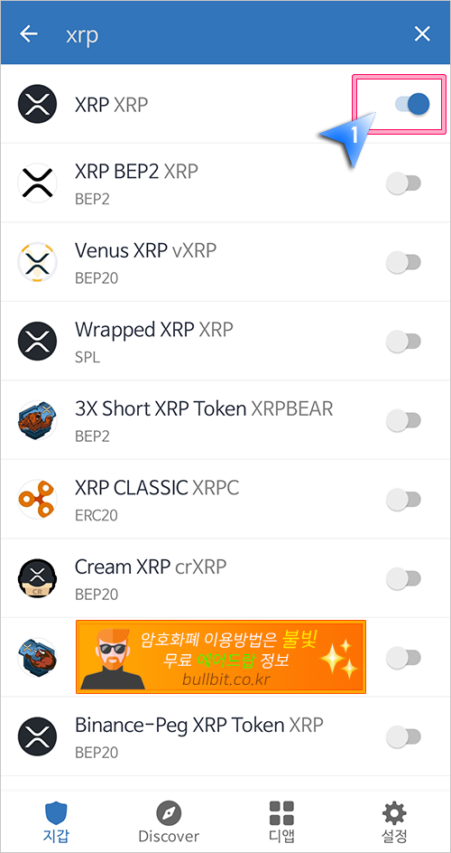 9. 만약 리플을 지갑에 추가시키고자 한다면 검색창에 리플인 xrp를 입력하고 우측의 단추버튼을 눌러서 활성화시켜주시면 지갑에 리플이 추가됩니다.