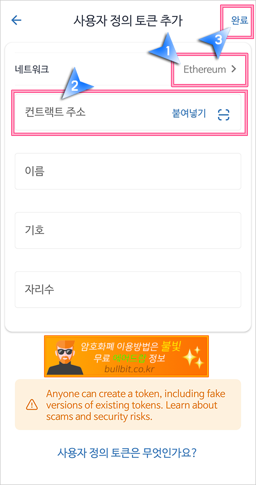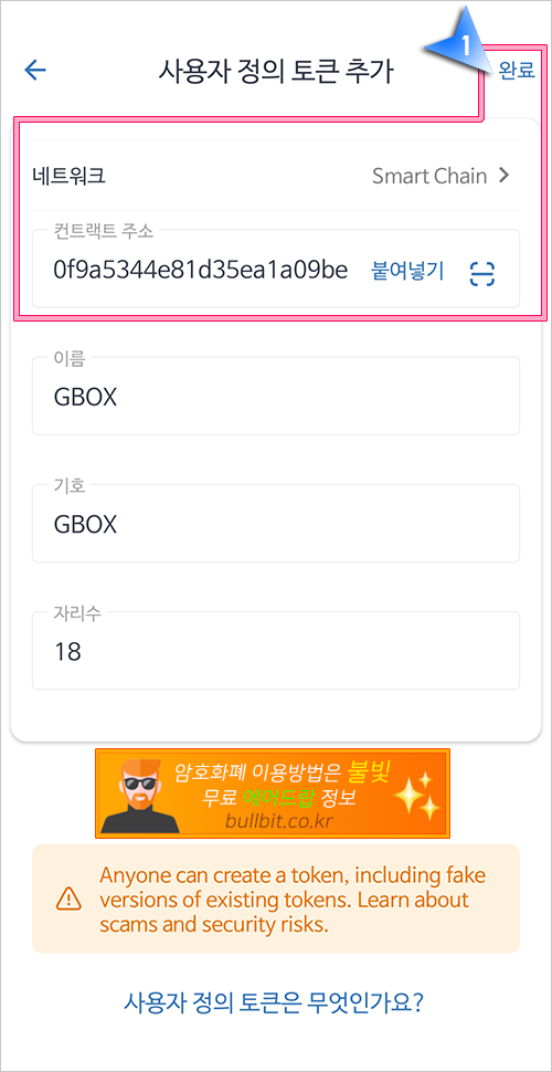 12. 네트워크에서 이더리움 계열인지, 아니면 스마트체인인지 선택하시고, 컨트랙트 주소를 붙여넣기 한 후, 완료 버튼을 눌러주시면 됩니다.