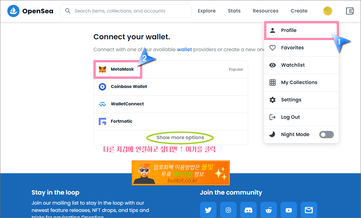 3. 오픈씨에 메타마스크나 카이카스 지갑 연동시키기