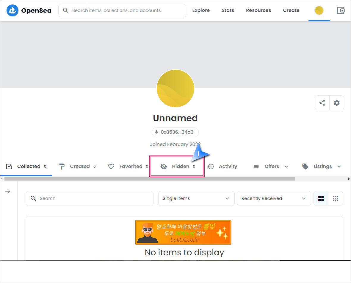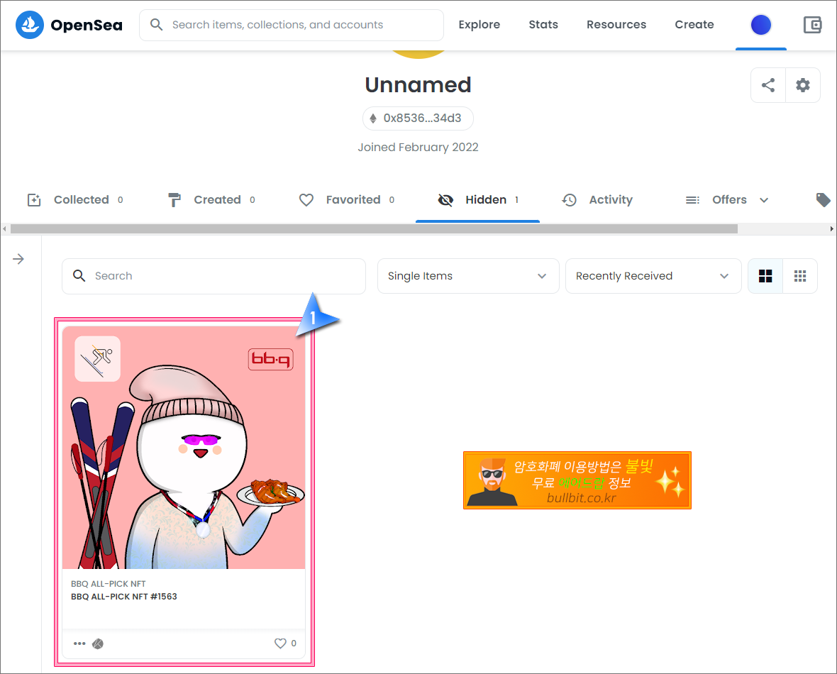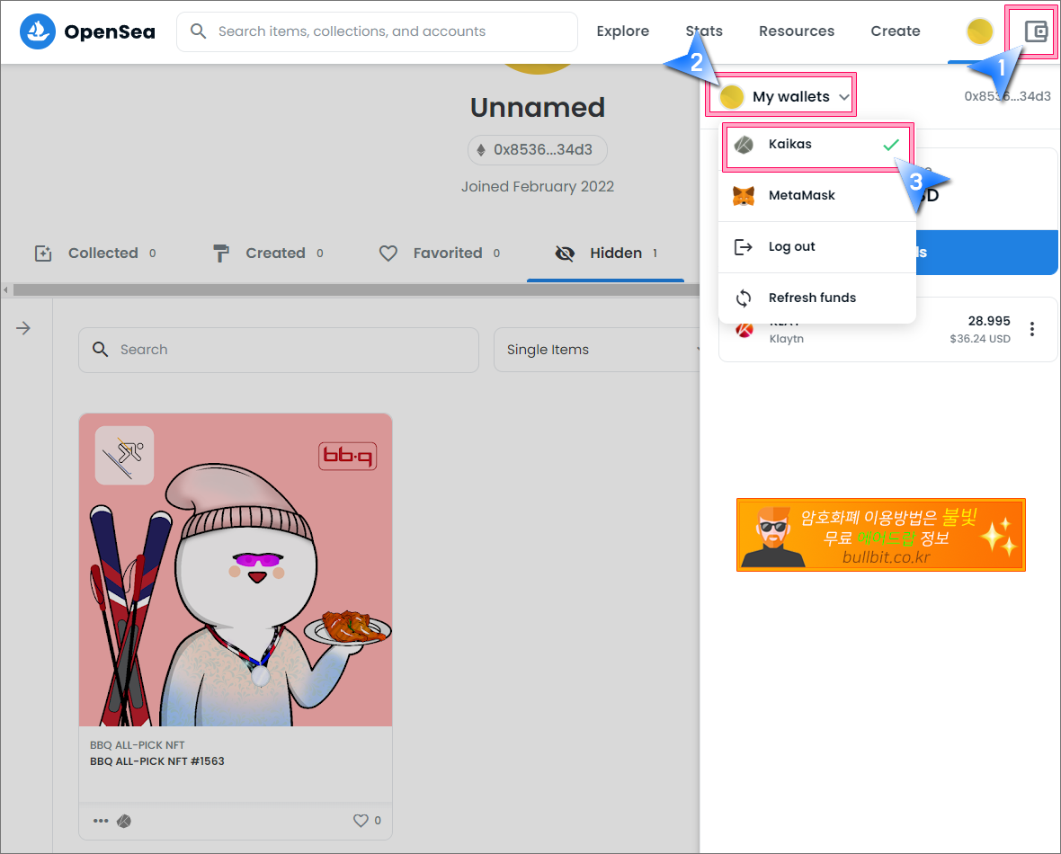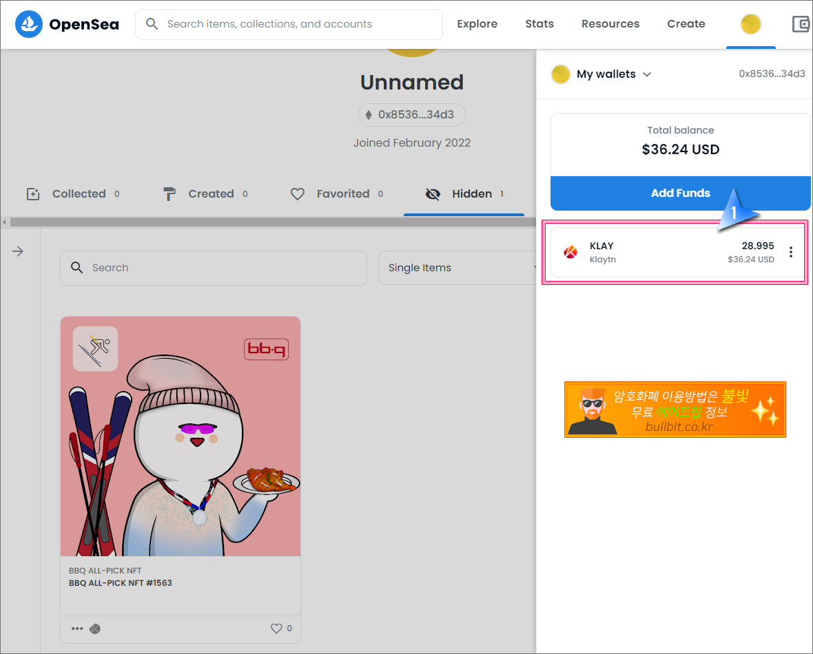 3. 오픈씨와 카이카스 지갑이 연동되어 있다면 Hidden이라는 적혀있는 곳 옆에 "1"이라는 숫자가 보입니다. 즉 1개의 NFT가 있다는 말입니다. 그곳을 클릭하면 아래 이미지처럼 BBQ에서 무료로 받은 NFT가 보입니다. 해당 NFT를 클릭합니다.