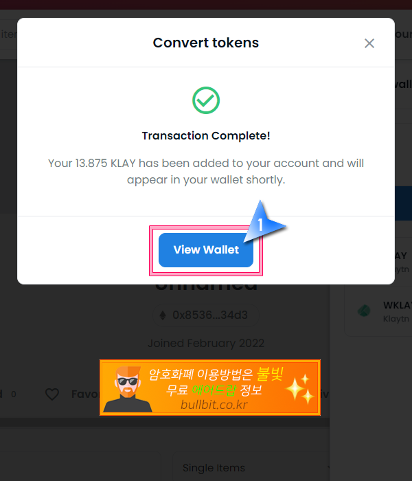 22. 성공적으로 WKLAY가 KLAY로 언랩되었습니다. "View Wallet" 버튼을 눌러서 확인해보겠습니다.