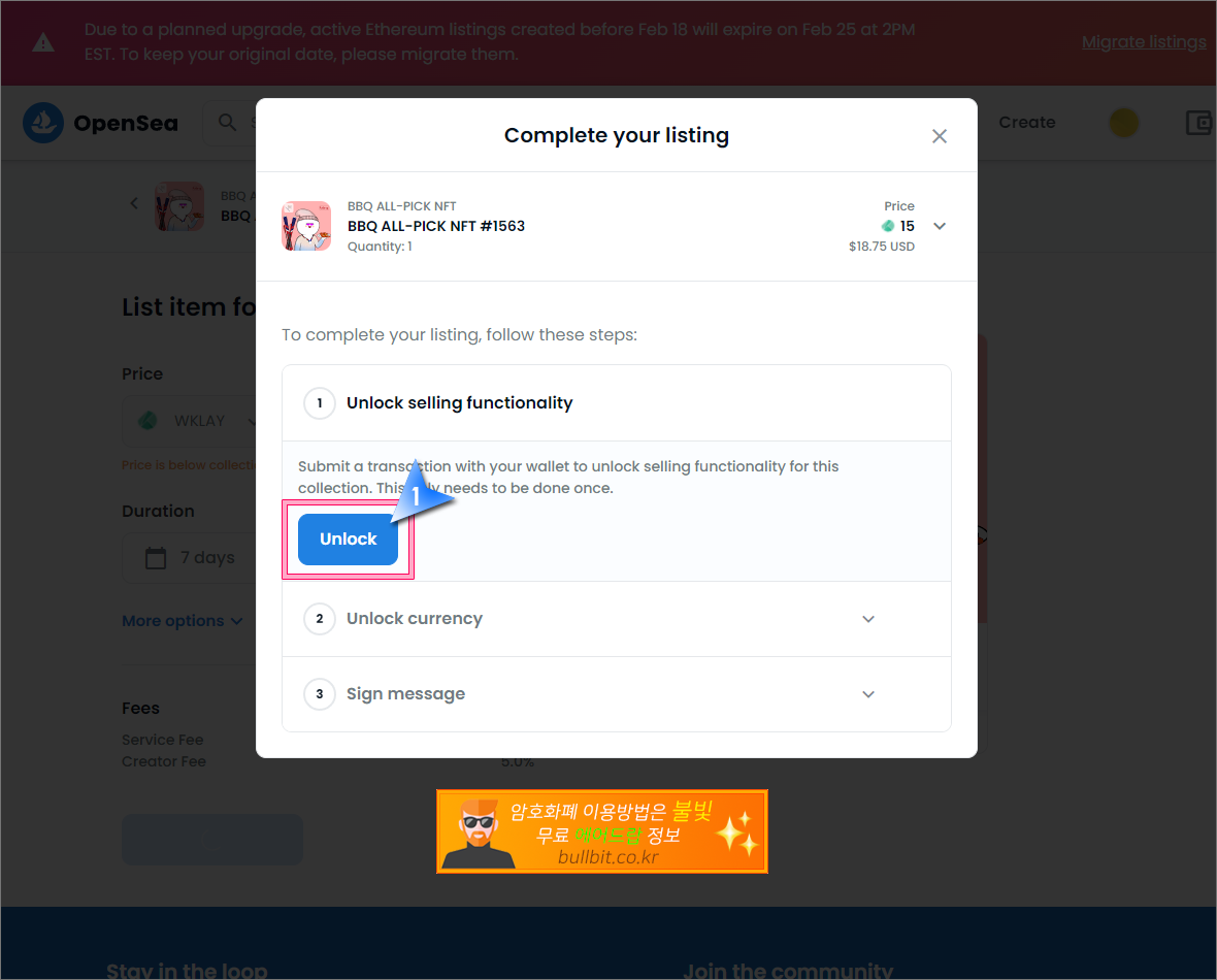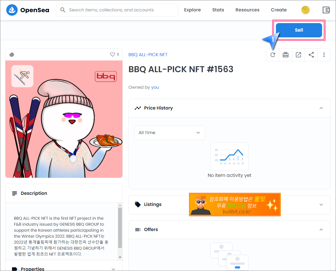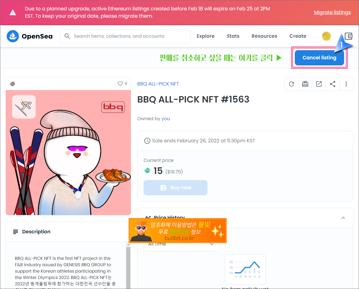 무료로 받은 BBQ NFT를 오픈씨에서 판매하여 현금화하는 방법