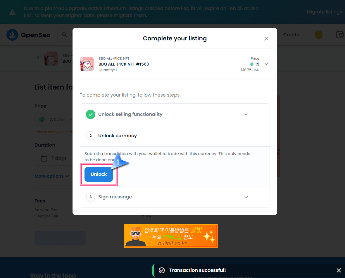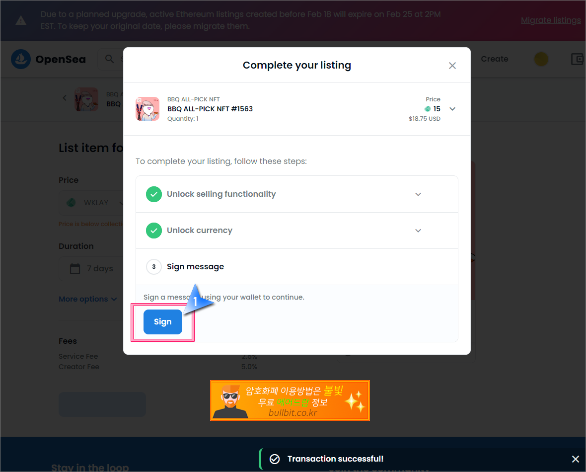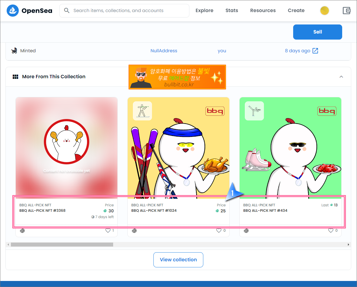 무료로 받은 BBQ NFT를 오픈씨에서 판매하여 현금화하는 방법