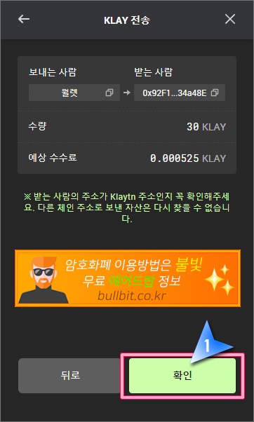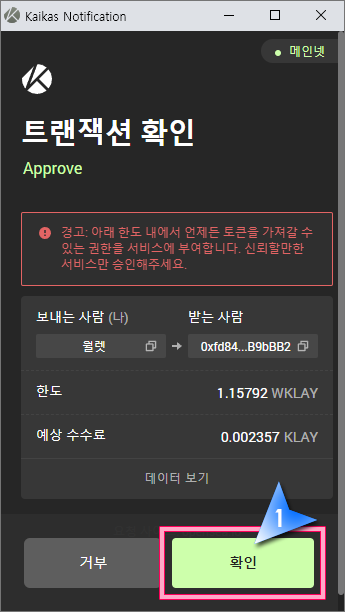 10. 예상수수료 등을 확인하는 트랜잭션 확인절차로 "확인" 버튼을 눌러줍니다.