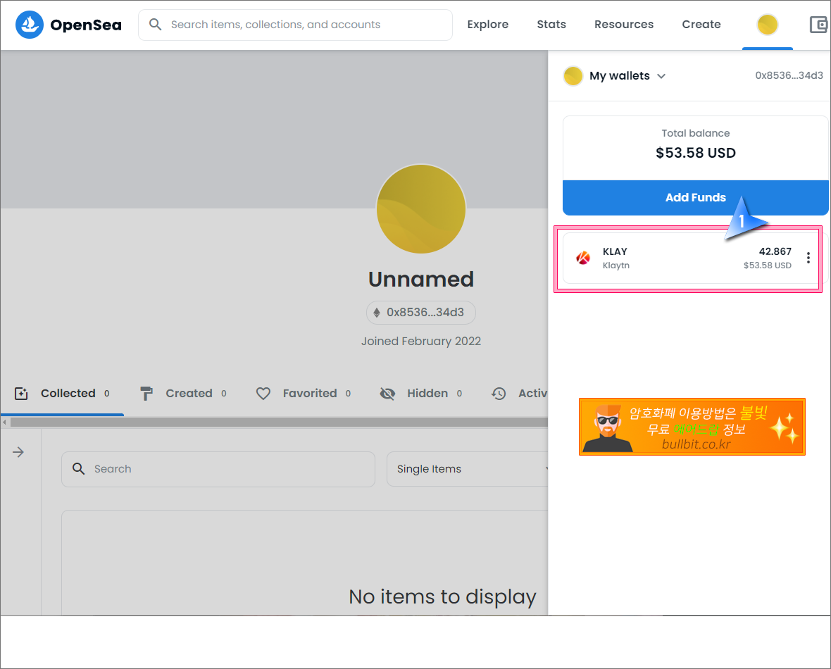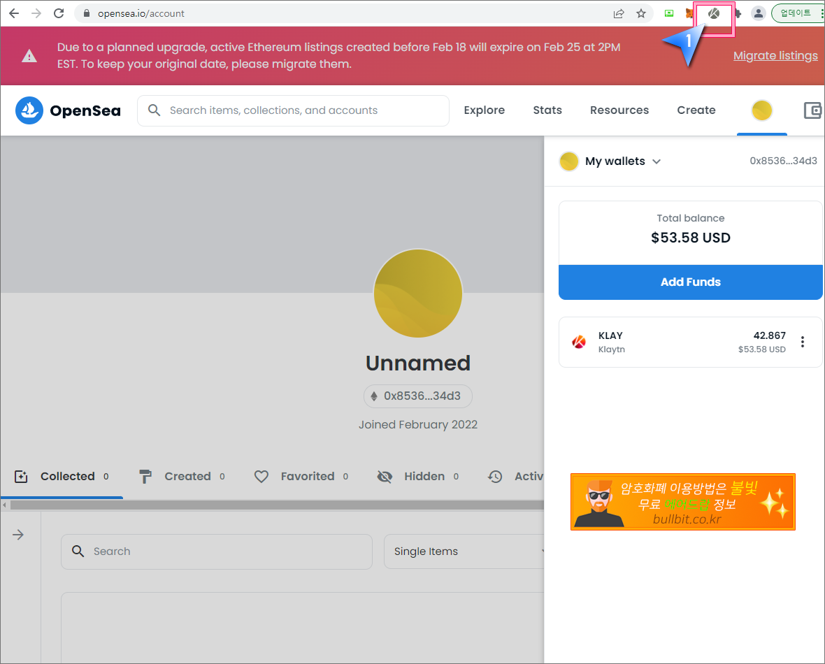 1. 위의 "오픈씨 가입 및 설정 따라하기 강좌"에 따라 오픈씨에 가입하고 메타마스크와 카이카스 지갑을 연동한 후, 크롬브라우저에서 아래의 오픈씨 링크를 클릭해서 오픈씨에 접속합니다.