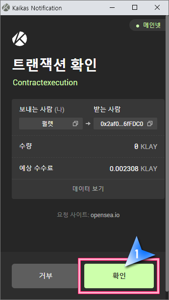 21. 아까도 말씀드렸지만 오픈씨에서 행하는 모든 구매와 판매 과정에는 전부 다 수수료가 포함됩니다. 트랜잭션 확인 하단의 "확인" 버튼을 클릭합니다.
