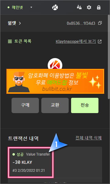 31. 1분 정도 지나서 확인해보니 이렇게 트랜잭션에 30KLAY가 전송완료 되었다고 떴습니다. 바이낸스에서 확인을 해보겠습니다.
