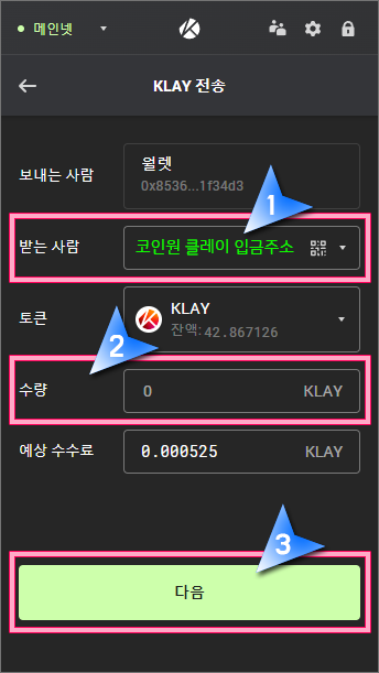 26. 받는 사람에 바이낸스 KLAY 주소를 입력하고, 수량에는 출금하려는 클레이 수량을 입력한 후, "다음" 버튼을 클릭합니다.