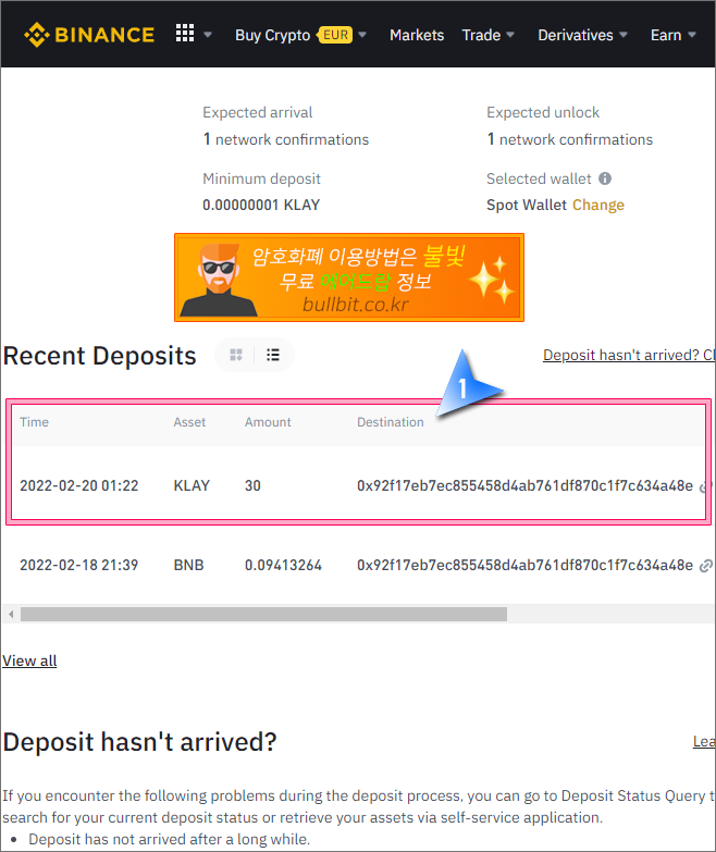 32. 바이낸스 입금 내역(Recent Deposits)을 보니 방금 카이카스 지갑에서 보낸 30KLAY가 도착한 것을 확인할 수 있습니다.