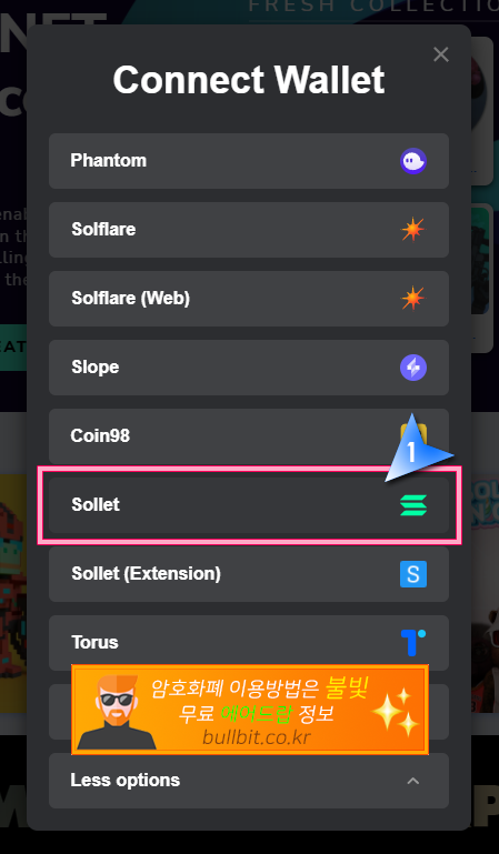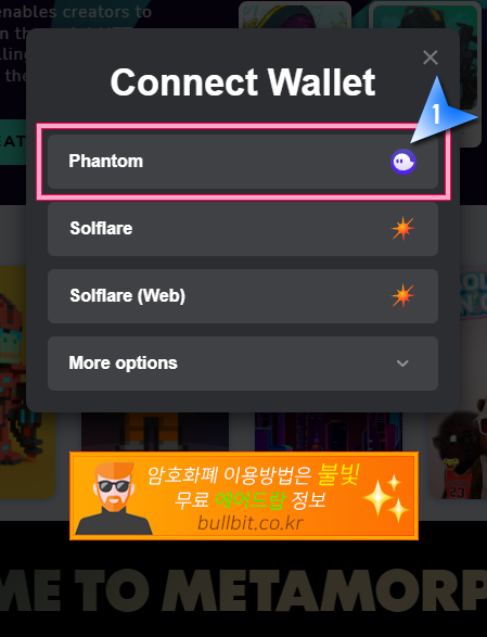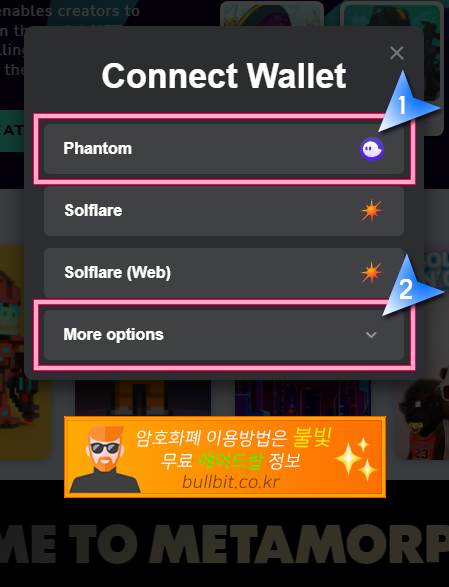 3. 연결한 지갑 목록이 나옵니다. 팬텀으로 이용하실꺼면 팬텀(Phantom)을 클릭하시면 되고 솔렛(Sollet)을 이용하실 분들은 "More options"을 클릭합니다.