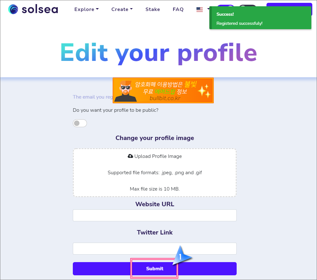 10. 가입이 완료되었습니다. 프로필 설정을 하라고 나오는데 그냥 나중에 해도 됩니다. "Submit" 버튼을 클릭합니다.