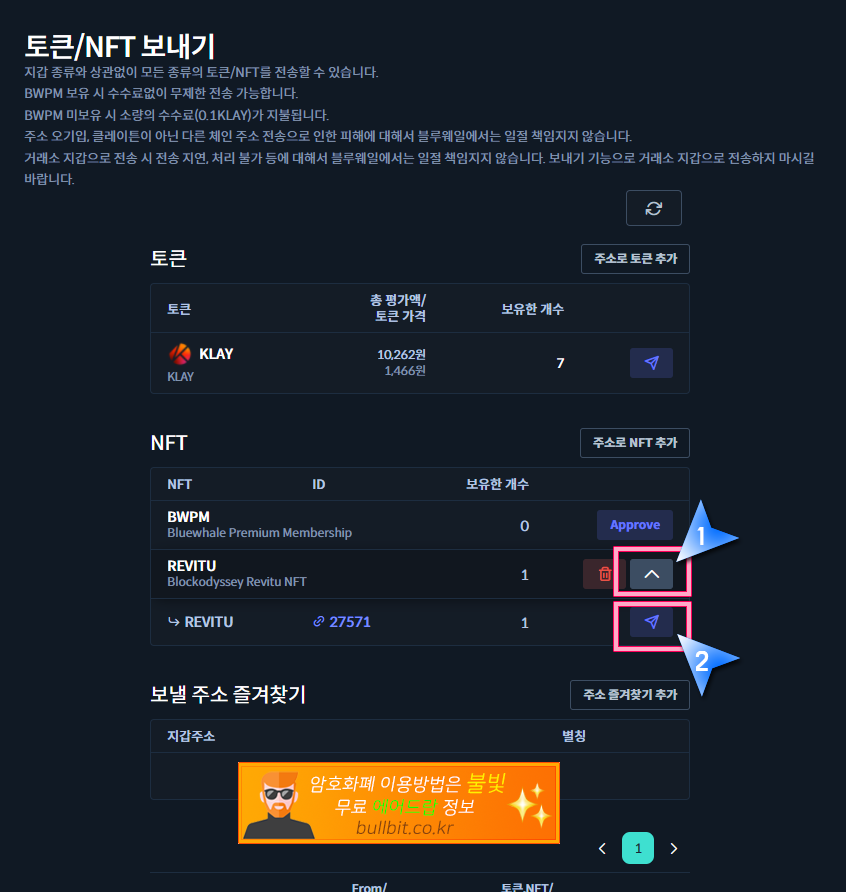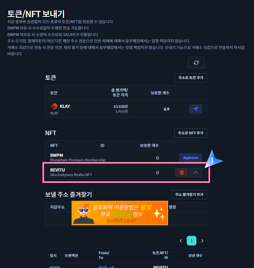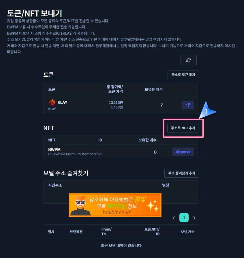 3. 클립에 있는 NFT를 블루웨일과 연동시키기 위해서 NFT 부분 우측의 "주소로 NFT추가" 버튼을 클릭합니다.