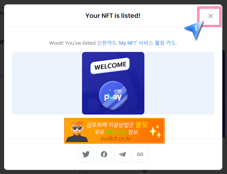 카카오톡에 가입하면 무료로 주는 환영 NFT나 신한카드나 현대카드에서 이벤트로 주는 무료 NFT가 있어도 팔지를 못하면 그냥 데이터 찌꺼기에 지나지 않기 때문에 혹시라도 누군가 사줄껄 기대하면서 오픈씨로 보내서 판매를 해보는 것도 괜찮다고 생각합니다. 저는 얼마전에 2022코~베이징 올림픽 기념으로 BBQ에서 무료로 나눠준 동계올림픽NFT를 오픈씨로 보내서 판매하고 현금화를 했습니다. 최고가가 12만원인가 했다고 하니 무료이지만 BBQ치킨을 몇마리 사먹고도 남을 정도입니다.
