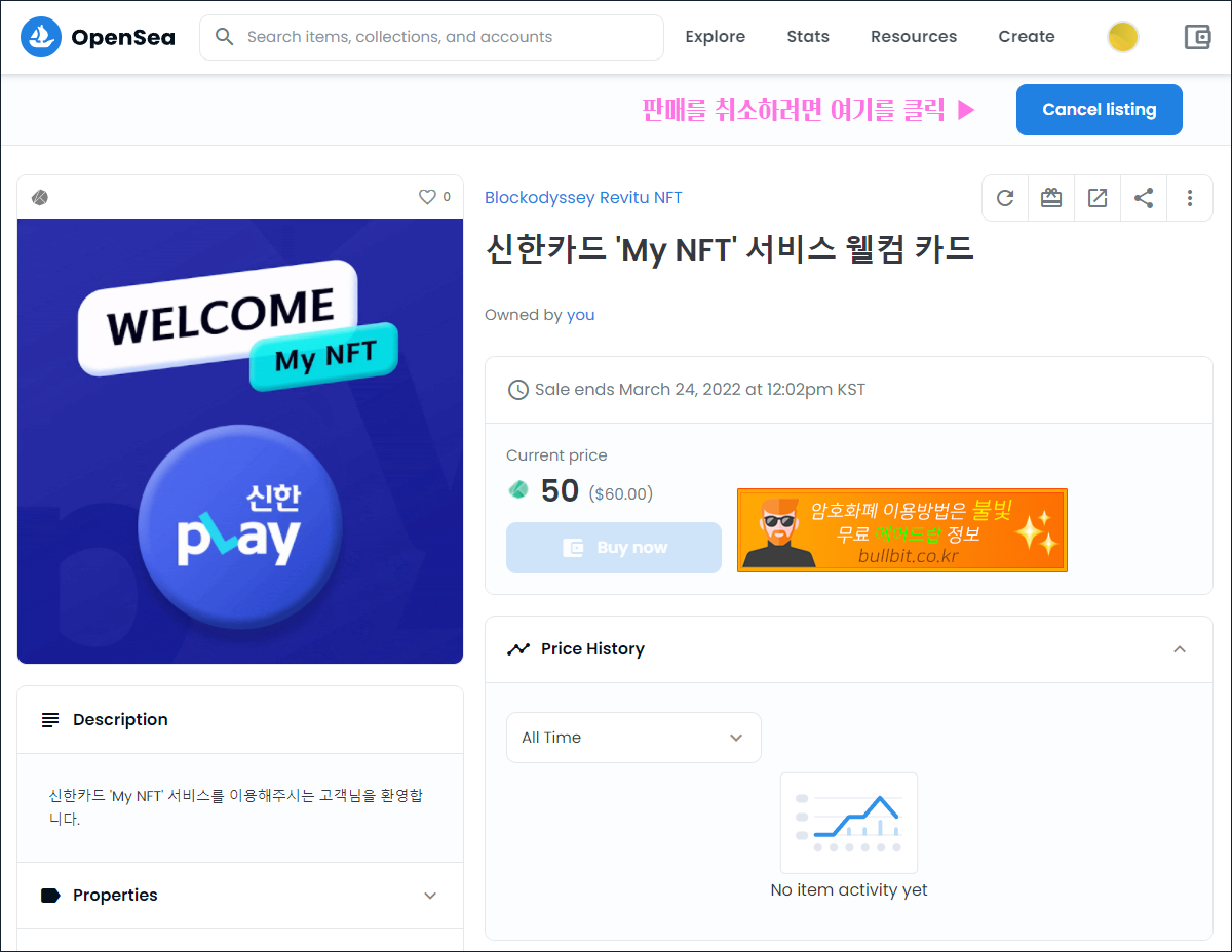 29. 해당 NFT를 판매 취소하려면 "Cancel listing" 버튼을 클릭하시면 됩니다. 가격 수정 버튼이 따로 없다보니 가격을 수정하려면 주문을 취소하고 다시 판매주문을 입력해야 합니다.