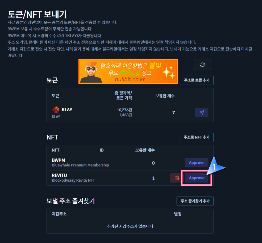 그리고 해당 NFT를 블루웨일에서 관리 및 처리할 수 있도록 Approve 버튼을 눌러주세요.