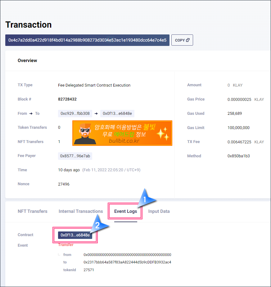 8. 해당 트랜잭션에 대한 상세 설명이 나오는데 하단에 있는 "Event logs"를 클릭한 후, "Contract" 부분을 클릭합니다.