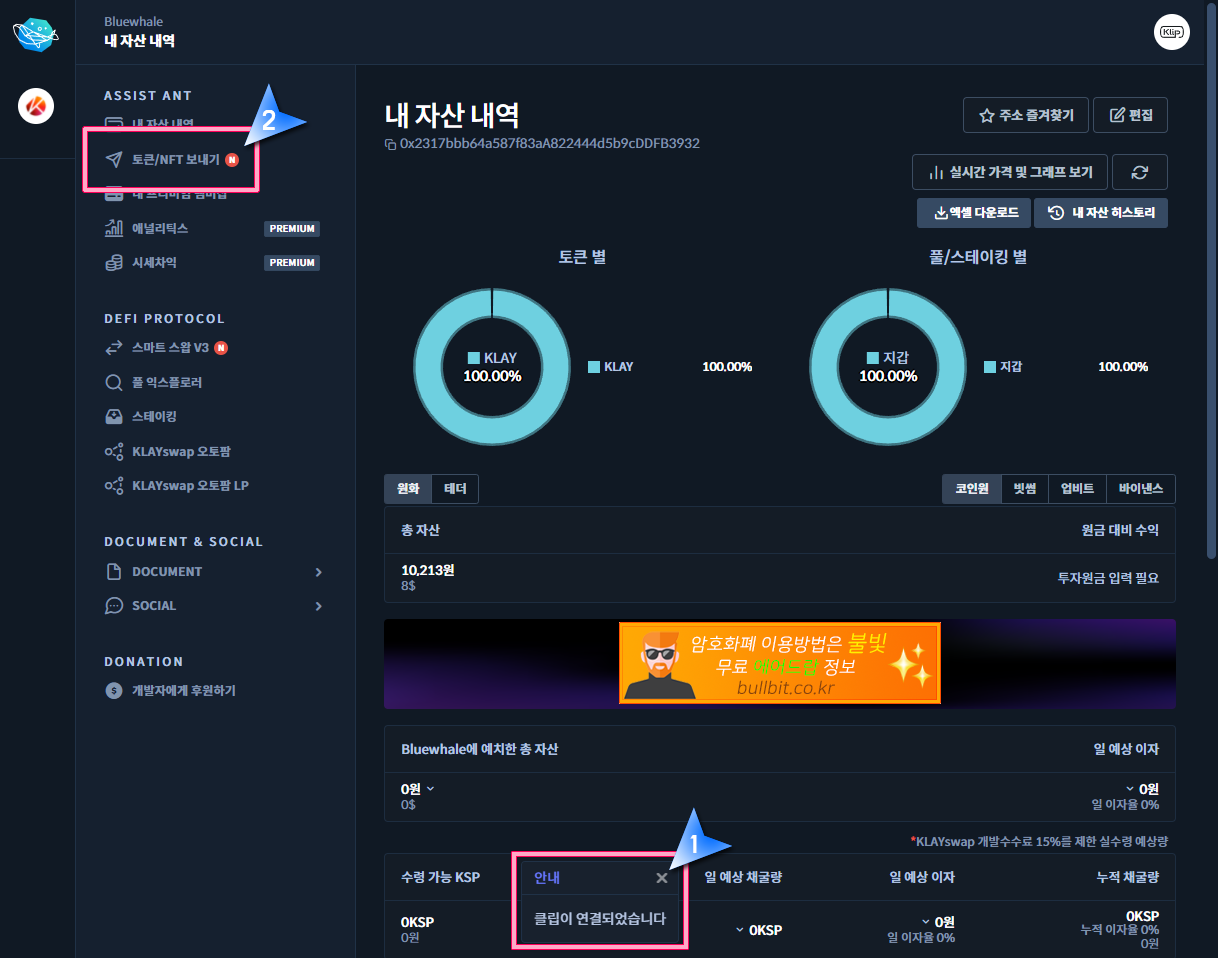 2. 블루웨일과 클립의 지갑 연결이 완료되면 하단에 "클립에 연결되었습니다"라고 뜹니다. 그러면 좌측의 "토큰/NFT 보내기"를 클릭합니다.