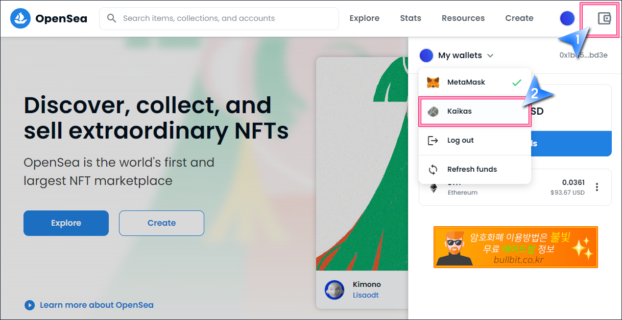 오픈씨와 카이카스가 연동되었다면 오픈씨에 접속해서 우측의 지갑 아이콘을 클릭하고 Kaikas를 선택해주시면 됩니다.