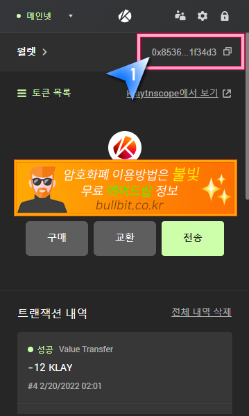 16. 카이카스 지갑 설치가 완료되었다면 아래 이미지처럼 카이카스 상단의 지갑 주소를 복사하여 방금 전의 '보낼 지갑 주소'에 넣고 "보내기" 버튼을 클릭합니다.