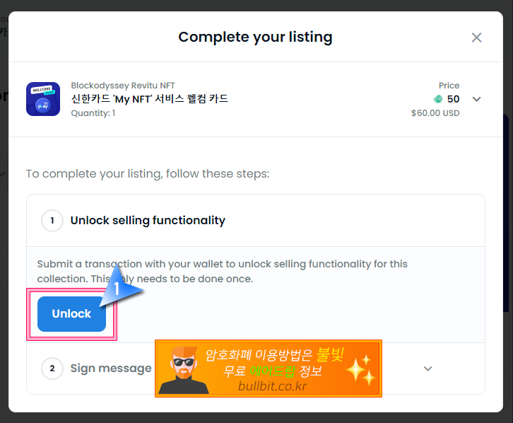 24. 오픈씨에서 NFT를 판매를 할 때 카이카스 지갑을 이용해서 하므로 카이카스 지갑의 승인이 필요합니다. "Unlock" 버튼을 눌러주세요.