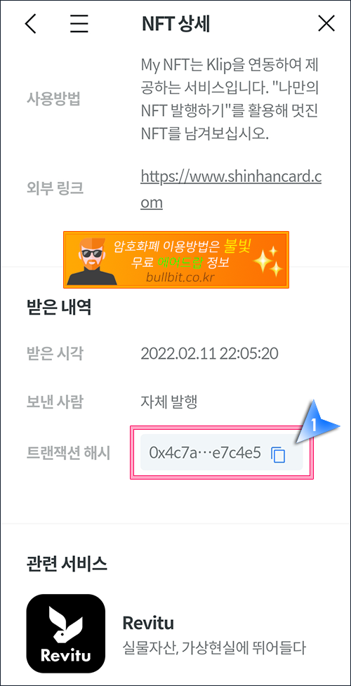 6. NFT상세 내역을 보면 중간쯤에 '트랜잭션 해시'라고 주소가 있습니다. 우측의 복사 아이콘을 클릭하여 주소를 복사합니다.