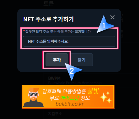 10. 조금 전의 NFT 주소 추가 입력부분에 방금 복사한 주소를 붙여넣기하고 "추가" 버튼을 클릭합니다.