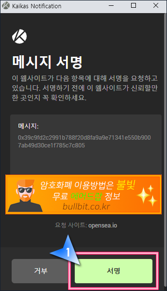 26. 이번에는 "Sign" 버튼을 눌러서 카이카스 지갑에서 서명을 해주세요.
