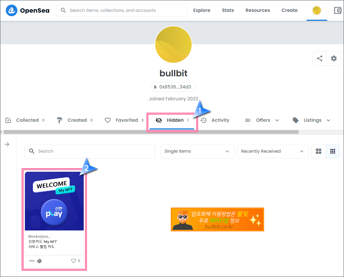 21. 중간쯤에 있는 Hidden 우측에 '1'이라는 숫자가 보인다면 정상적으로 NFT가 클립에서 카이카스로 전송되어 오픈씨에 표시되는 겁니다. 만약 2개를 보냈다면 Hidden 우측에 '2'가 나타납니다. 히든을 클릭한 후 나오는 본인의 NFT를 선택합니다.