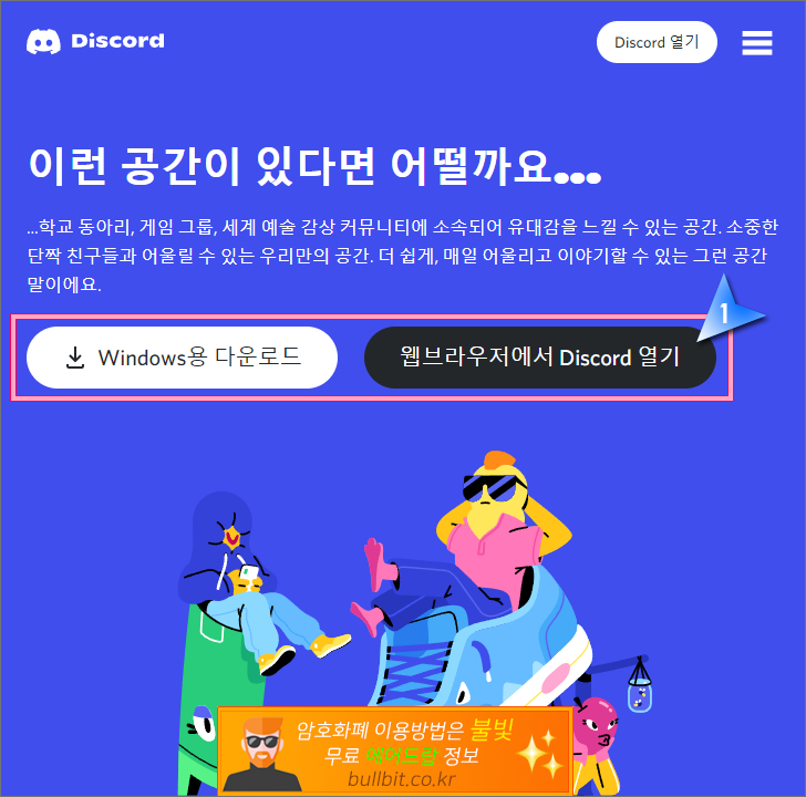 2. '윈도우용 다운로드'를 클릭해서 PC에 설치하여 사용할 수도 있지만 저처럼 PC에 뭘 설치하는 것을 싫어하시는 분들은 그냥 "웹브라저에서 디스코드 열기"를 클릭해서 이용하시면 됩니다.