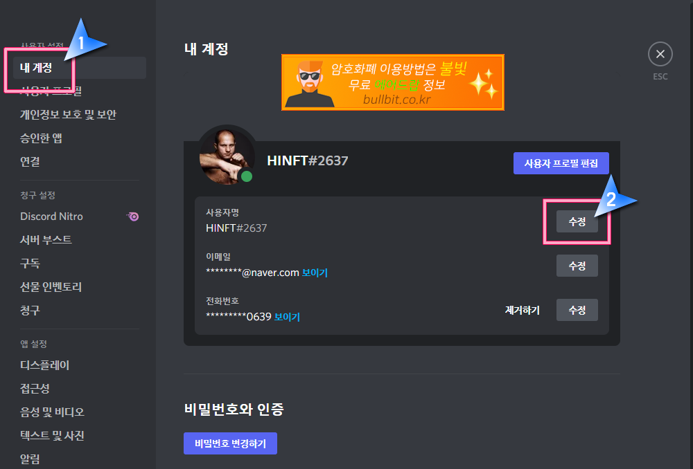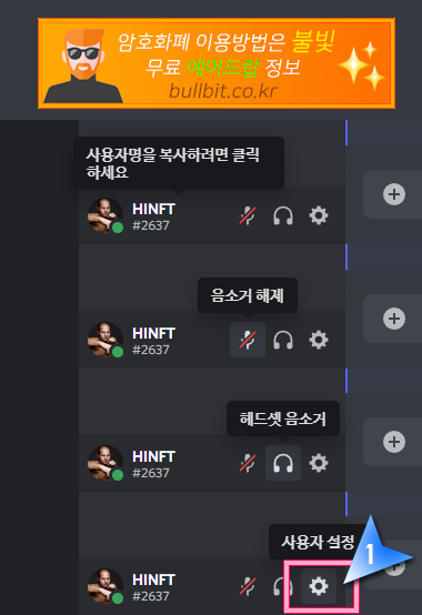 5. 좌측 하단에 자신의 사용자명이 있는데 NFT 민팅이나 토큰 무료에어드랍시 사용자명을 복사해서 붙여넣기하라고 하면 이 사용자명을 클릭하면 복사됩니다. 디스코드 아이디는 "아이디#숫자"형식으로 샵(#)표시 뒤에 숫자가 포함됩니다. 그리고 음소거 버튼, 헤드셋 음소거 버튼, 사용자 설정을 할 수 있는 메뉴가 있습니다.