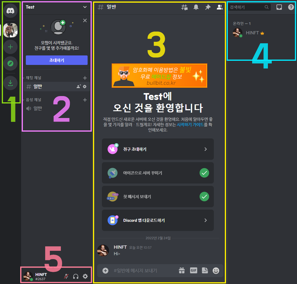 디스코드 메인화면을 5개 파트로 나눠서 설명을 드리도록 하겠습니다.