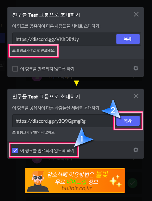 7. 초대하기 링크는 기본으로 7일 후에 만료가 되도록 셋팅되어 있는데 기간을 설정하고 싶지 않을 때는 "이 링크를 만료되지 않도록 하기"에 체크를 하시고 만드시면 됩니다. "복사" 버튼을 클릭해서 초대 코드를 복사하고 친구나 지인들에게 코드를 전달해주시면 됩니다.