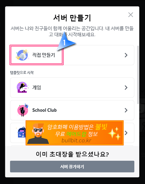 2. 서버 만들기에서 "직접 만들기"를 클릭합니다.