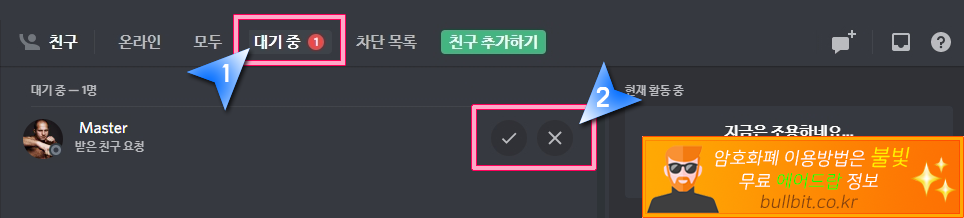 3. 친구요청을 받은 쪽의 화면입니다. 이렇게 누군가 친구요청을 해오면 "대기 중"에 표시되고 그곳을 클릭하면 친구요청을 수락하거나 거부할 수 있습니다. 친구요청을 수락하면 친구와 메시지를 주고 받거나 통화를 할 수 있습니다.