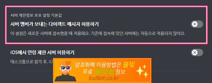 사용자 설정에는 엄청나게 많은 기능들이 있는데 "서버 멤버가 보내는 다이렉트 메시지 허용하기" 버튼은 활성화가 아닌 해제를 해두시는 것이 좋습니다. DM은 인스타그램처럼 1:1 대화가 가능하지만 디스코드 DM의 99%는 스캠이라고 생각하셔도 됩니다. 어쩌다 인증을 위해 DM을 켜야하는 경우도 있지만 필요할 때 그때만 켜시면 되고 비활성화시켜 놓으시기 바랍니다.