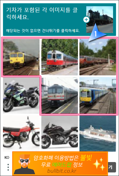 6. 윗쪽에서 제시하는 질문에 맞게 아래의 이미지를 클릭해주시면 됩니다. 기차가 포함된 이미지를 클릭하라고 하면 아래 이미지처럼 기차가 나온 이미지를 전부 다 클릭해주시면 됩니다. 올바르게 다 클릭을 했어도 다시한번 더 요구하기도 하는데 동일하게 질문에 맞는 답을 찾아주시면 됩니다.