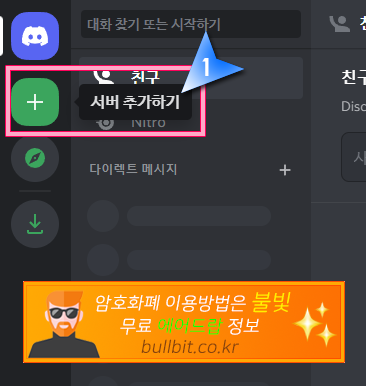1. 좌측 상단의 "+" 버튼을 클릭하면 서버를 추가할 수 있습니다. 서버는 카카오톡의 단톡방 정도로 생각하시면 됩니다.