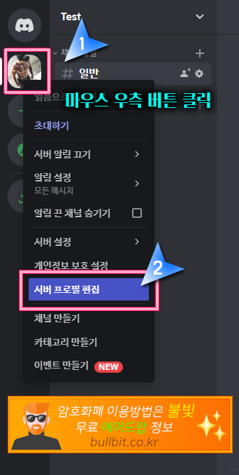 서버 아이콘 위에서 마우스 우측 버튼을 눌러서 "서버 프로필 편집"을 눌러서 각각의 서버마다 프로필을 다르게 설정이 가능합니다. 각 서버별로 요구하는 프로필 사진과 아이디 형식이 다른 경우가 있습니다. 그럴 경우에는 서버 프로필 편집을 사용하시면 됩니다.