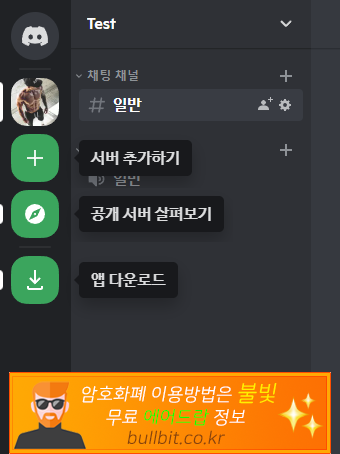 1. 좌측 부분에는 서버 목록들과 서버 추가, 공개 서버, 앱 다운로드 링크들이 있습니다. 여러개의 서버가 있다면 좌측에 세로로 길게 목록들이 표시됩니다.