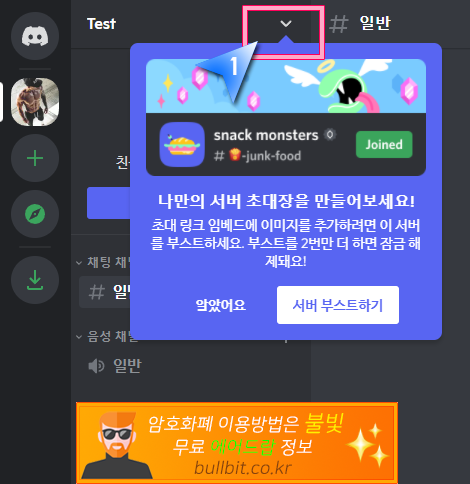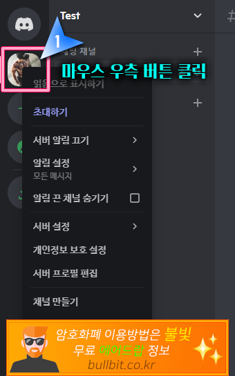 각각의 서버들의 아이콘 위에서 마우스 오른쪽 버튼을 누르면 서버 프로필 편집이나 초대코드, 알림 설정 등을 할 수 있습니다.